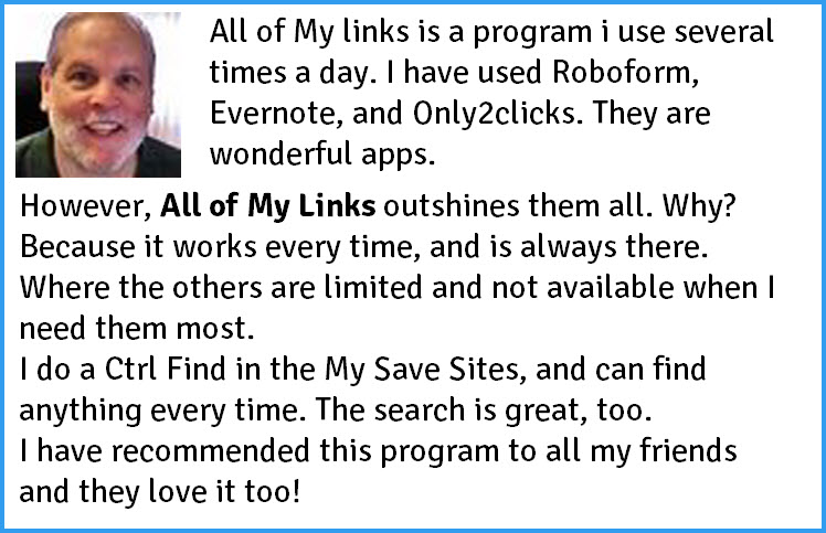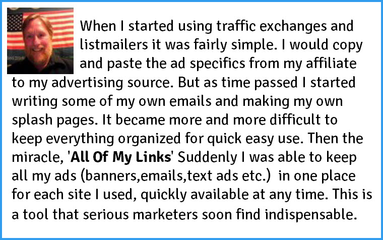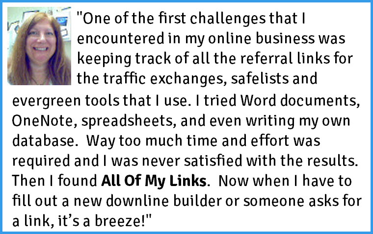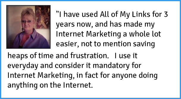 I have used All of My Links for 3 years now, and has made my Internet Marketing a whole lot easier... Sue Nicol / Affiliate Marketer Sign Up Now!