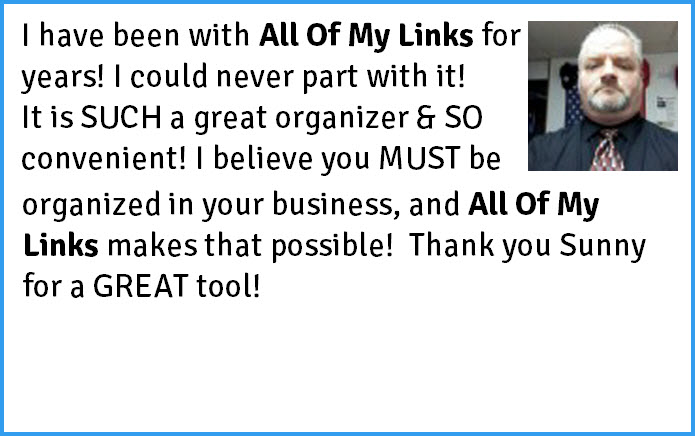 I believe you MUST be organized in your business, and All Of My Links makes that possible! John Lederer / Affiliate Marketer Sign Up Now!